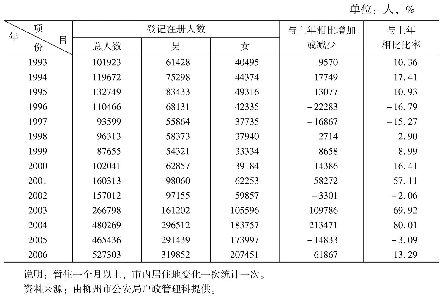 由于具有较好的基础设施和诸多企业落户,创造了较多的就业机会,因此柳州市在人口增长方面,社会增长占了很大比重。1993~2006年,柳州市