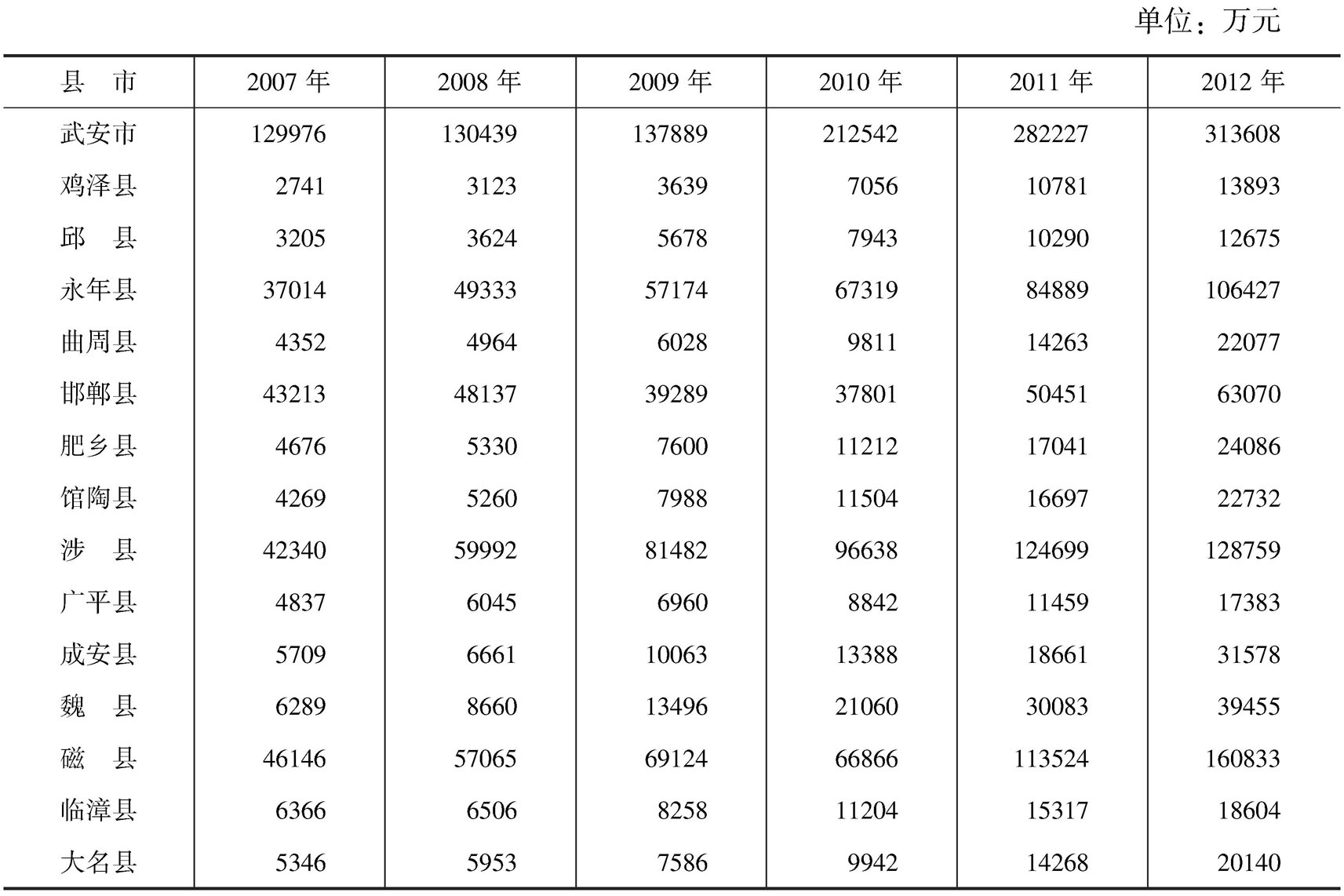 从表28-1可以看出,邯郸市财政收入规模的绝对数稳步增加,其中2007年突破60亿元大关,2010年突破100亿元大关,2012年突破180亿元大关;2007~2012年平均财政预算收入为22.90亿元;2011年绝对数增长最快,比上年增长43.05亿元,增幅达37.14%,2008年增长最慢,绝对数增长8.0亿元,增幅