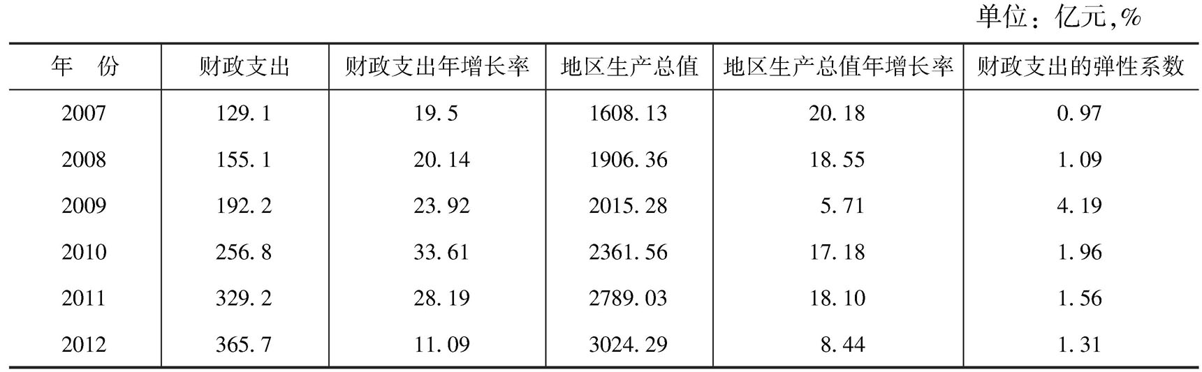 从表28-1可以看出,邯郸市财政收入规模的绝对数稳步增加,其中2007年突破60亿元大关,2010年突破100亿元大关,2012年突破180亿元大关;2007~2012年平均财政预算收入为22.90亿元;2011年绝对数增长最快,比上年增长43.05亿元,增幅达37.14%,2008年增长最慢,绝对数增长8.0亿元,增幅