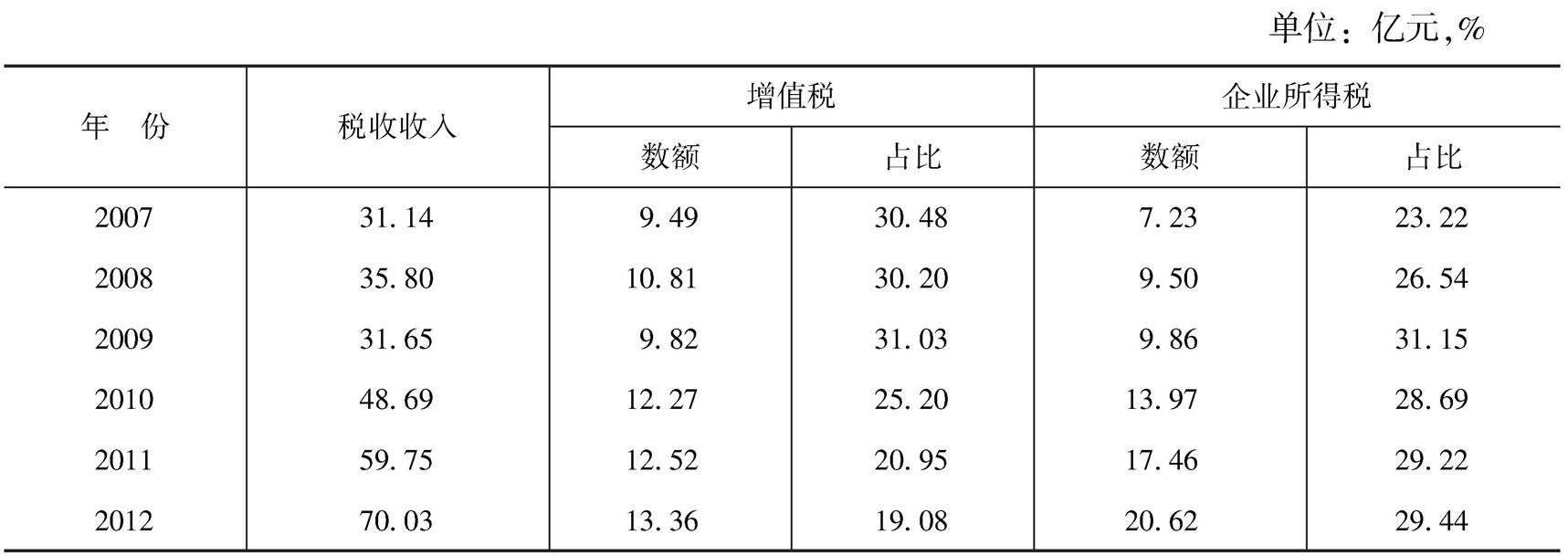从表29-1来看,2007~2012年,聊城市财政收入逐年增加,2007年达到42.40亿元,2010年突破70亿元,2012年达到104.49亿