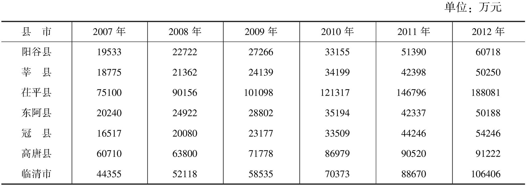 从表29-1来看,2007~2012年,聊城市财政收入逐年增加,2007年达到42.40亿元,2010年突破70亿元,2012年达到104.49亿