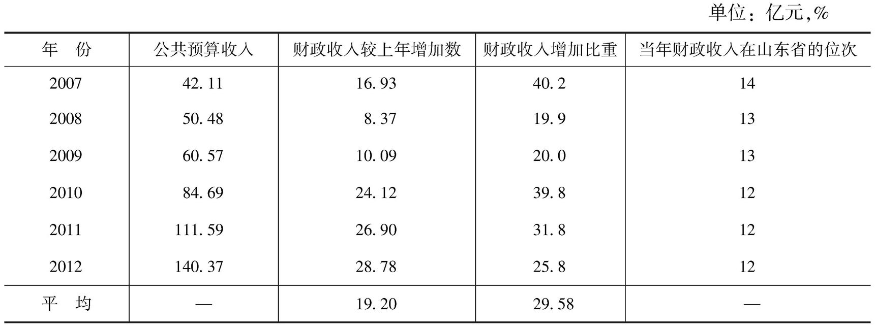 从表30-1可以看出,菏泽市财政收入规模的绝对数稳步增加,其中2007年突破40亿元,2009年突破60亿元,2010年突破80亿元,2012年突破140亿元;2007~2012年财政收入较上年增加数平均为19.20亿元,年均增加比重为29.58%;当年财政收入增长率位居全省前列。2007~2012年,菏泽市财政收入在山东省的