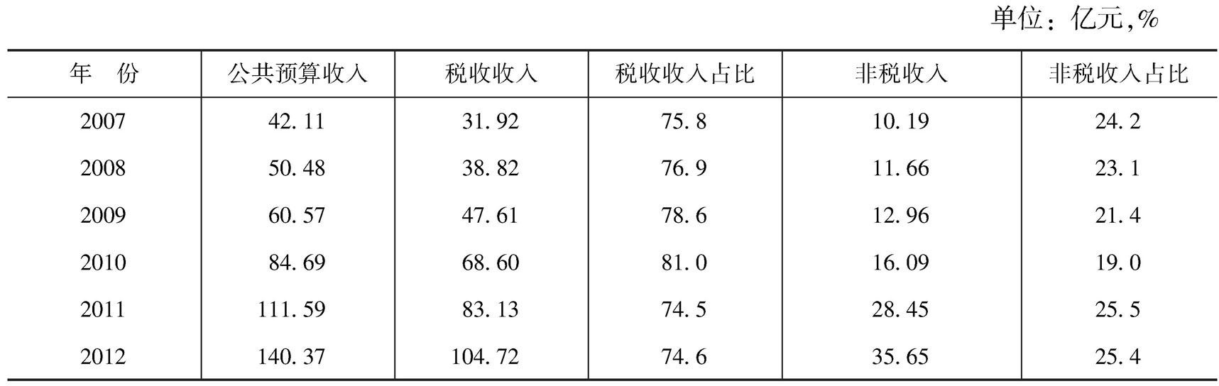 从表30-1可以看出,菏泽市财政收入规模的绝对数稳步增加,其中2007年突破40亿元,2009年突破60亿元,2010年突破80亿元,2012年突破140亿元;2007~2012年财政收入较上年增加数平均为19.20亿元,年均增加比重为29.58%;当年财政收入增长率位居全省前列。2007~2012年,菏泽市财政收入在山东省的
