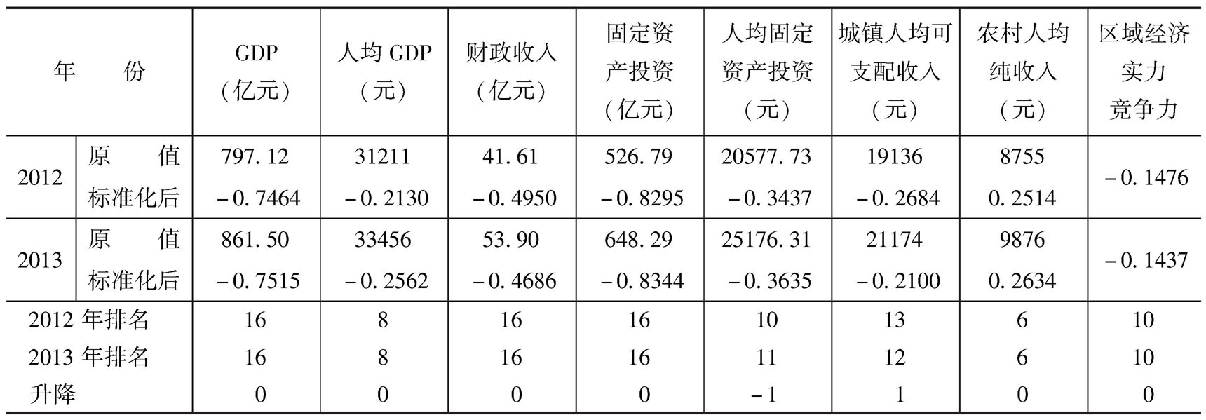 表17-2-1 漯河市2012~2013年区域经济实力竞争力及其四级指标