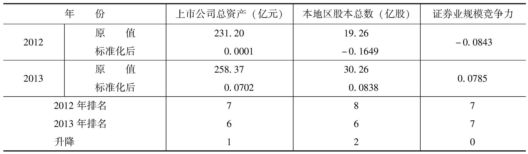 2012~2013年,漯河市区域经济实力竞争力指标及其下属指标,在河南省的排位变化情况,如表17-2-1和图17-2-1所示。