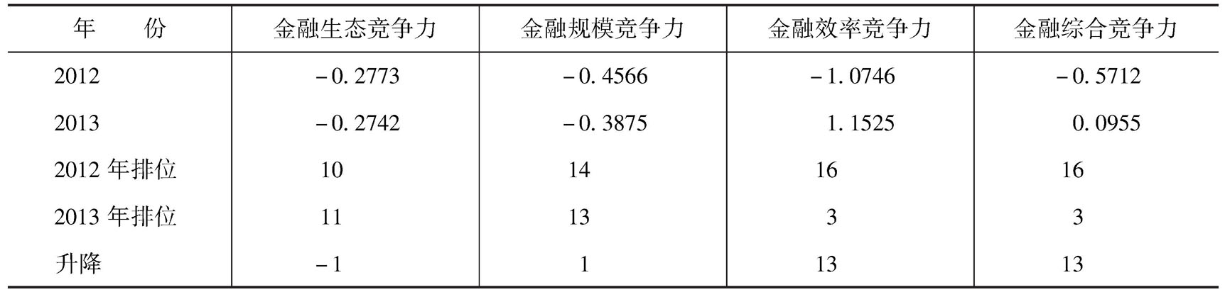 2012~2013年,漯河市区域经济实力竞争力指标及其下属指标,在河南省的排位变化情况,如表17-2-1和图17-2-1所示。