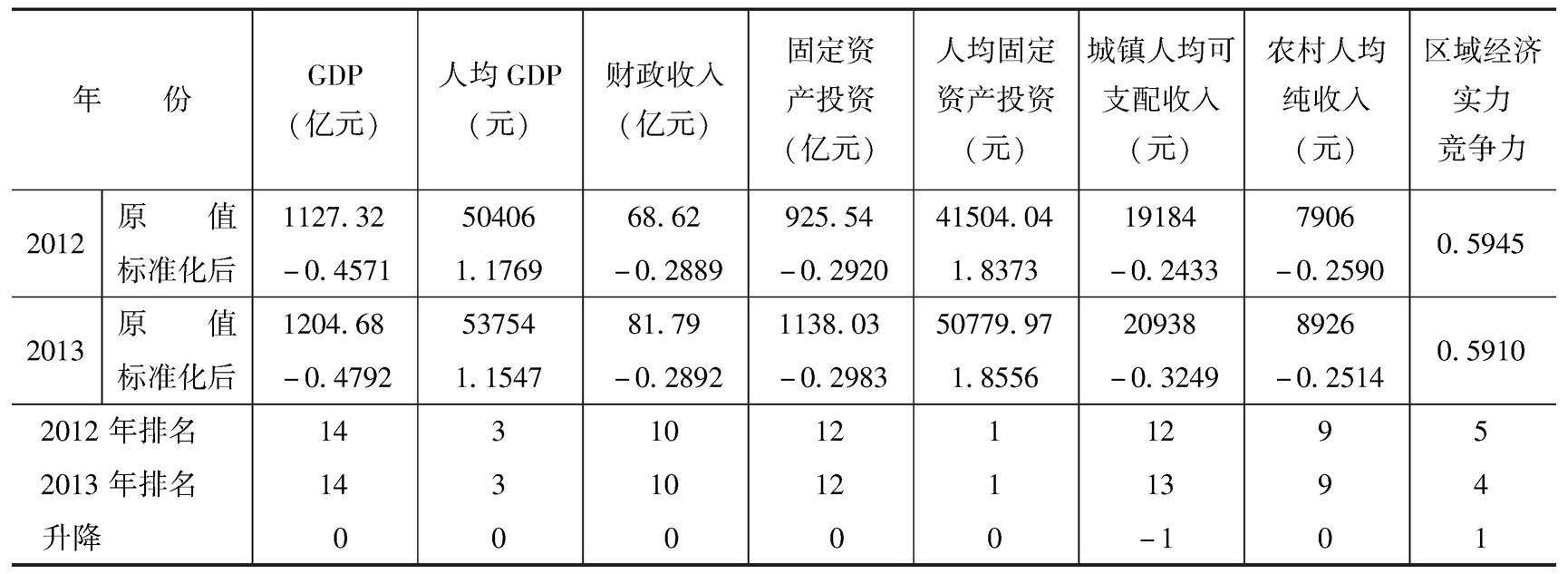 表18-2-1 三门峡市2012~2013年区域经济实力竞争力及其四级指标