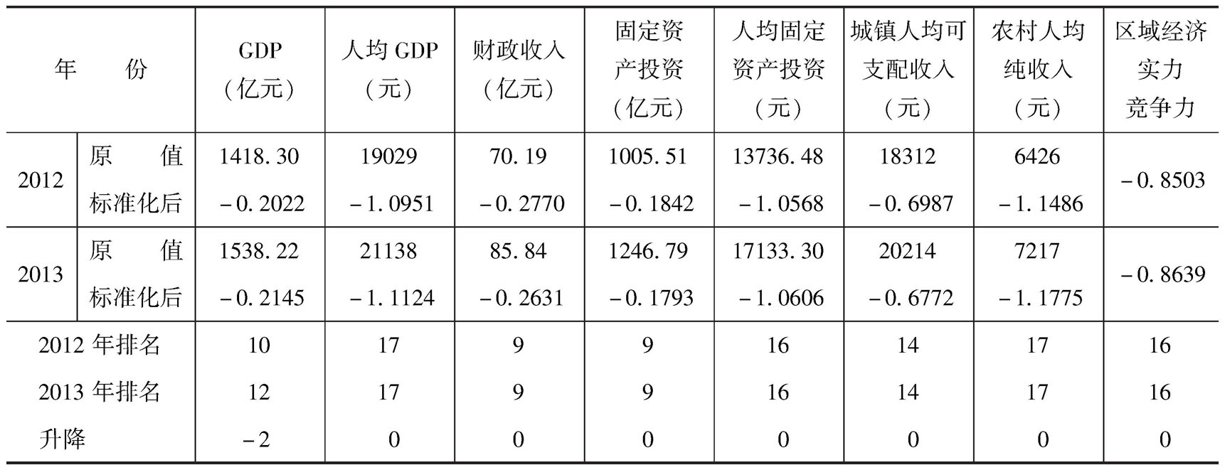 2012~2013年,商丘市区域经济实力竞争力指标及其下属指标在河南省的排位变化情况,如表19-2-1和图19-2-1所示。