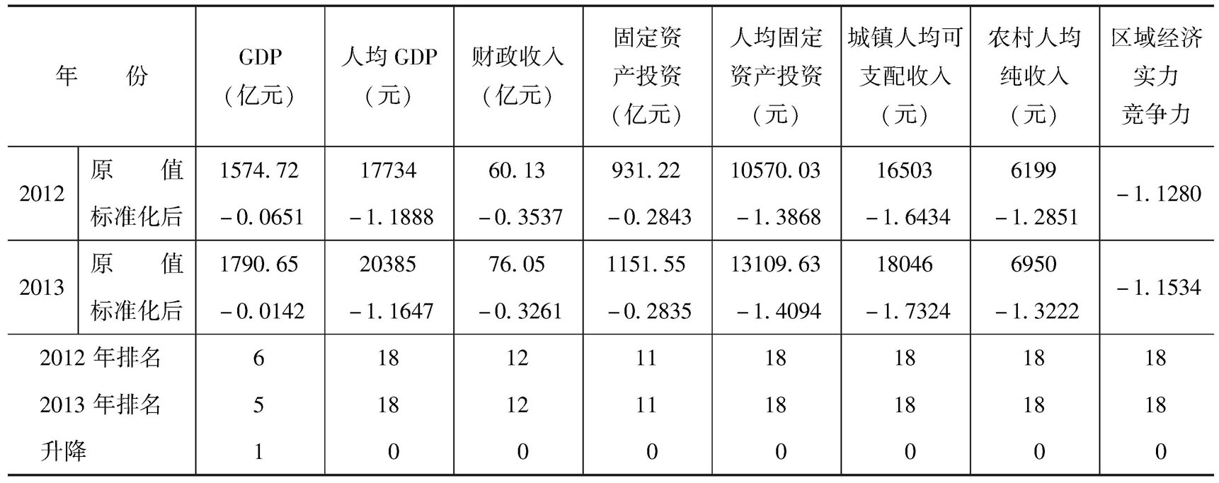 2012~2013年,周口市区域经济实力竞争力指标及其下属指标在河南省的排位变化情况,如表20-2-1和图20-2-1所示。