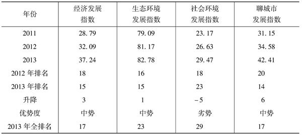 (4)从排位变化的动因看,在生态环境发展指数、经济发展指数排位上升和社会环境发展指数排位下降的综合作用下,2013年聊城市发展指数排位上升6位,居中原经济区第14位。