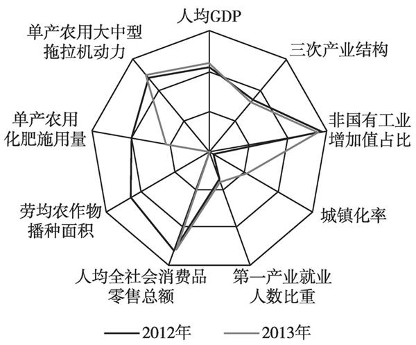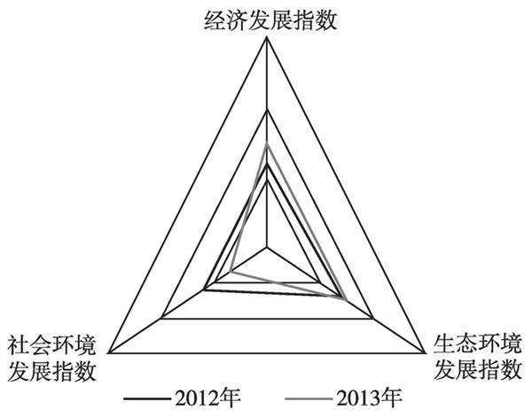 (3)从雷达图图形变化看,2013年与2012年相比,面积有所增大,聊城发展指数排位呈现上升趋势。