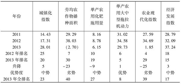 (1)2013年聊城市经济发展指数排位处于第15位,表明其在中原经济区处于中势地位,与2012年相比上升3位。其中工业化指数排位处于第5位,与2012年相比排位下降1位;城镇化指数排位处于第20位,与2012年相比排位上升5位;农业现代化指数排位处于第29位,与2012年相比排位下降25位。