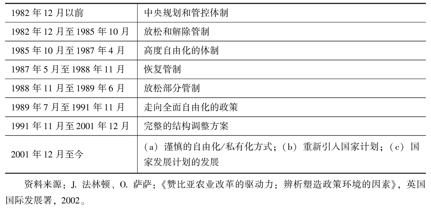 不同时期经济政策的变化,对赞比亚农业部门的发展变迁有着决定性的影响。表1按时间顺序列出了经济政策