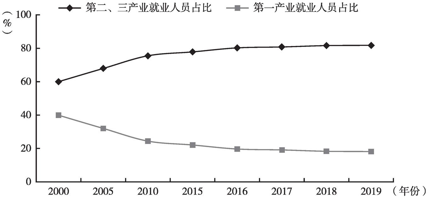 图片名称: 2000~2019年广东三次产业就业人员结构变化