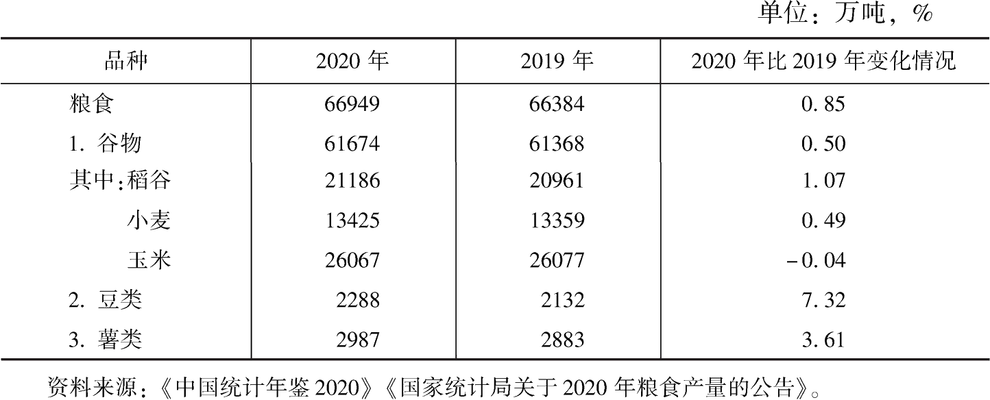 2020年,受新冠肺炎疫情和部分地区严重洪涝灾害影响,各级政府牢把粮食安全,狠抓粮食生产,通过层层压实粮食生产责任,进一步加大了对粮食生产的支持力度;通过鼓励恢复双季稻生产,引导做好闲置或撂荒地复垦复耕,增加了粮食种植面积;通过完善农业支持保护制度,增加粮食作物的直接补贴力度,充分调动了地方抓粮和农民种粮的积极性;通过土地适度规模经营和健全农业社会化服务体系,推动了小农户与现代农业发展的有机衔接,实现了粮食作物增产增效;通过加强灾情和病虫害监测预警机制,积极落实防灾减灾措施,做好统防统治、技术指导等一系列生产性服务,强化了粮食作物抗风险能力等。2020年,面临重大内外部风险,在打好一系列政策“组合拳”的基础上,全国粮食总产量达66949万吨,比2019年增加565万吨,增长0.9%,再创历史最高水平。