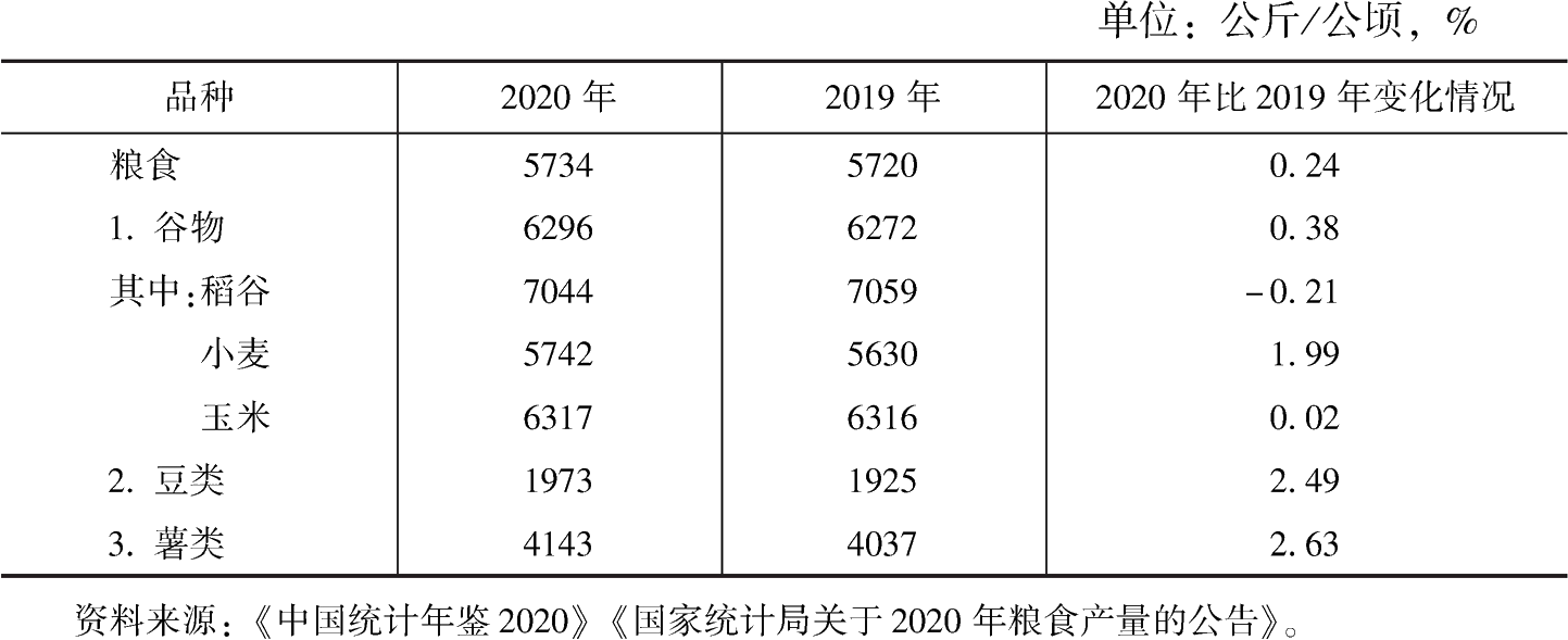 图片名称: 2019~2020年主要粮食作物单产及变化情况