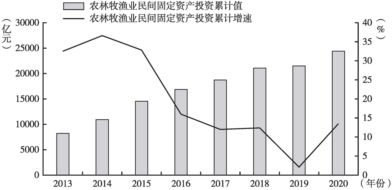 从绝对规模看,中国财政农林水支出总量不断增加。如图1所示,农林水支出规模从2010年的8130亿元增长到2020年的23904亿元,财政支持“三农”的力度不断增大。从增速看,农林水支出平均增长率达到12.46%,高于同期一般公共预算支出11.44%的增长率,体现出农业农村是中国当前财政支出的优先保障领域。但农林水支出波动显著,随着中国经济逐步进入新常态,财政收入增速趋缓,相应的农林水支出增速下降显著。2010~2015年,农林水支出增速平均为17.33%,但2016~2020年的农林水支出平均增速迅速下滑到6.61%。