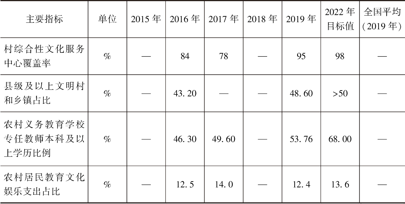 党的十九大把乡村产业发展从过去“生产发展”转变为“产业兴旺”,并将“产业兴旺”作为乡村振兴战略的核心因素,这意味着乡村产业发展从产量向质量、粗放向精细、低端向高端、不可持续向可持续转变。就云南省2015~2019年乡村振兴之产业兴旺指标来看,粮食综合生产能力呈波动趋势,说明了其仍不稳定,但是在2015年就已经达到2022年所设定的目标值;农业科技进步贡献率总体呈上升趋势,在2019年达到全国平均水平59.2%,但是与2022年目标值61.5%还有一定距离;全员劳动生产率总体上也呈上升趋势,在2019年达到最大值,且2018年与2019年均已超过2022年目标值,但是与全国平均水平相比,差距较大;农产品加工产值与农业总产值比虽然呈上升趋势,但是没有达到全国平均水平,也没有达到2022年目标值,证明云南省在产业链方面取得的成效较低,农产品附加值低,未将产业链充分延伸至农产品精加工、深加工,导致农业产业链不长、农产品附加值不高;休闲农业和乡村旅游接待人次总体呈上升趋势,但是与2022年目标值3亿人次还有一定距离(见表4-1)。