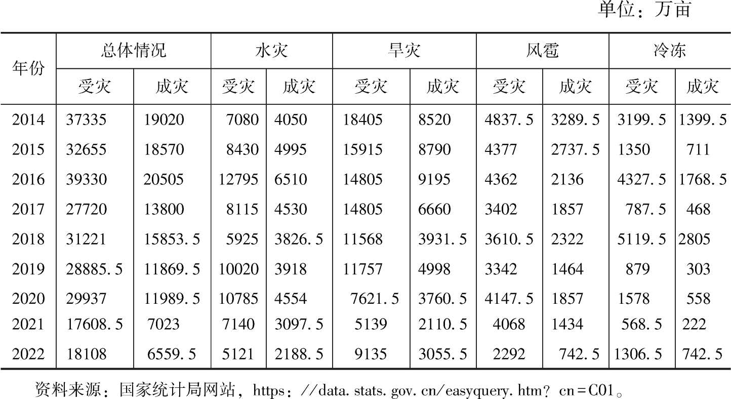 中国气候种类丰富、复杂多变,属于“气候脆弱区”,是世界上易受自然灾害影响的国家之一。随着全球气候变暖,世界各地极端气候和意外自然灾害多发重发,已经成为粮食产量波动的重要因素李祎君等:《气候变化对中国农业气象灾害与病虫害的影响》,《农业工程学报》2010年第S1期。,对保障粮食和重要农产品稳定安全供给构成威胁。2020年湖南、江西严重洪涝致早稻单产减少;2021年北方5省遭遇罕见秋汛致1.1亿亩冬小麦晚播;2022年夏季长江流域发生了自新中国成立以来最为严重的干旱高温气候,对当地农业生产、居民生活、生态安全等造成影响;2023年黄淮海麦区“烂场雨”,导致粮食作物收获、晾晒困难。灾害性天气只是农业成灾的外部环境致因,是否最终成灾取决于农业生产系统本身对这种环境胁迫的应对能力覃志豪等:《我国主要农业气象灾害机理与监测研究进展》,《自然灾害学报》2005年第2期。。农业防灾减灾救灾是农业稳产增产的重要保障。健全的农业防灾减灾救灾体系是维护农业生产秩序的防护墙,可以有效提高应对自然灾害的韧性和适应性。近年来,中国农业防灾减灾救灾工作取得突出成就,然而一些工作举措仍然存在明显的碎片化、临时性和随机性问题。2024年中央一号文件指出“加强农村防灾减灾工程、应急管理信息化和公共消防设施建设,提升防灾避险和自救互救能力”。未来,在气候变化的大背景下,极端异常气候和意外自然灾害多发重发将在不同区域上演,必须加快健全农业防灾减灾救灾体系,以体系建设的稳定性应对自然灾害的不确定性,最大限度减少农业自然灾害对粮食生产、生态环境和农民生活的不利影响,夯实粮食和重要农产品安全稳定供给的根基。