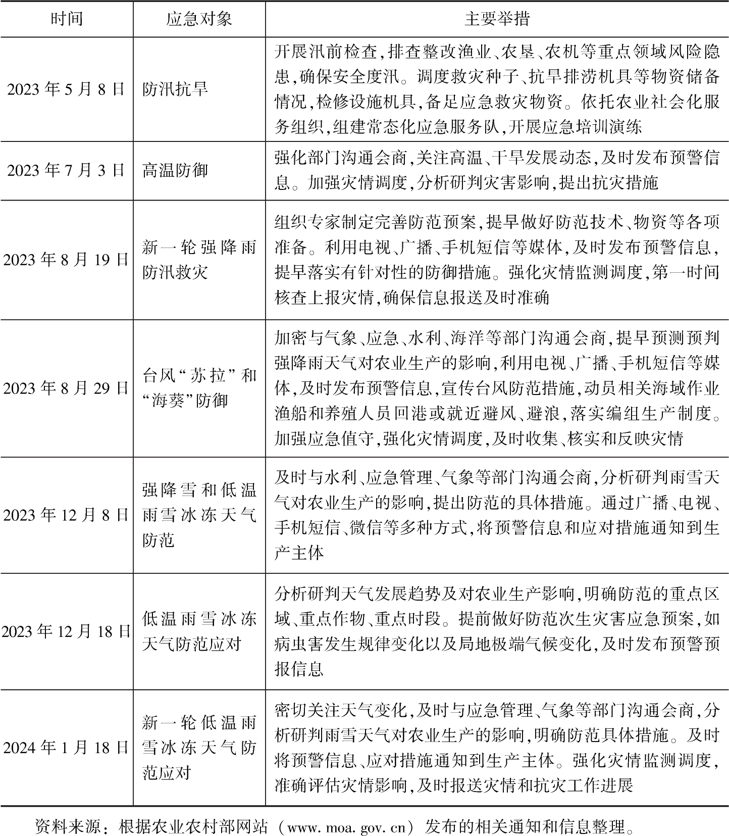 中国气候种类丰富、复杂多变,属于“气候脆弱区”,是世界上易受自然灾害影响的国家之一。随着全球气候变暖,世界各地极端气候和意外自然灾害多发重发,已经成为粮食产量波动的重要因素李祎君等:《气候变化对中国农业气象灾害与病虫害的影响》,《农业工程学报》2010年第S1期。,对保障粮食和重要农产品稳定安全供给构成威胁。2020年湖南、江西严重洪涝致早稻单产减少;2021年北方5省遭遇罕见秋汛致1.1亿亩冬小麦晚播;2022年夏季长江流域发生了自新中国成立以来最为严重的干旱高温气候,对当地农业生产、居民生活、生态安全等造成影响;2023年黄淮海麦区“烂场雨”,导致粮食作物收获、晾晒困难。灾害性天气只是农业成灾的外部环境致因,是否最终成灾取决于农业生产系统本身对这种环境胁迫的应对能力覃志豪等:《我国主要农业气象灾害机理与监测研究进展》,《自然灾害学报》2005年第2期。。农业防灾减灾救灾是农业稳产增产的重要保障。健全的农业防灾减灾救灾体系是维护农业生产秩序的防护墙,可以有效提高应对自然灾害的韧性和适应性。近年来,中国农业防灾减灾救灾工作取得突出成就,然而一些工作举措仍然存在明显的碎片化、临时性和随机性问题。2024年中央一号文件指出“加强农村防灾减灾工程、应急管理信息化和公共消防设施建设,提升防灾避险和自救互救能力”。未来,在气候变化的大背景下,极端异常气候和意外自然灾害多发重发将在不同区域上演,必须加快健全农业防灾减灾救灾体系,以体系建设的稳定性应对自然灾害的不确定性,最大限度减少农业自然灾害对粮食生产、生态环境和农民生活的不利影响,夯实粮食和重要农产品安全稳定供给的根基。