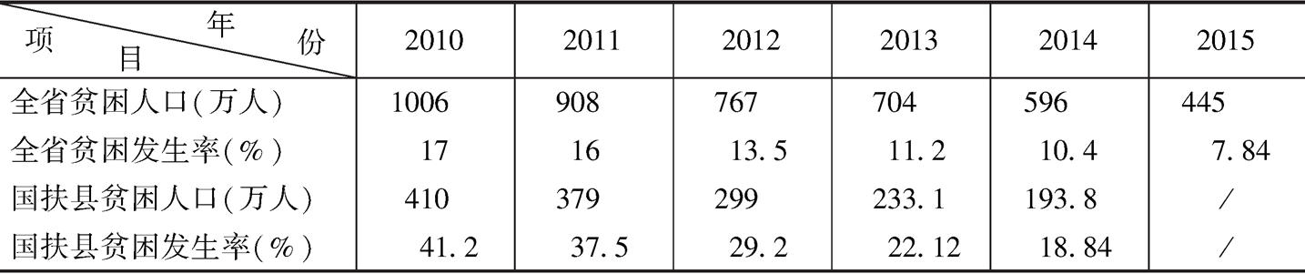 全省农村贫困人口数量快速减少。据统计,全省贫困人口从2010年1006万人下降到2015年的445万人,减少了572万人,减少率56.9%;贫困发生率由17%下降到7.84%。20个国家扶贫开发工作重点县贫困人口从410万人下降到2014年的193.8万人,减少了216.2万人,减少率52.7%;贫困发生率由41.2%下降到18.84%。