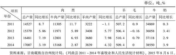 表2 2011~2014年玛曲县畜产品产量