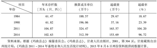 2014年,全县年末存栏各类牲畜102.63万头(只、匹),其中牦牛存栏49.69万头,羊存栏50.70万只,马存栏2.24万匹。甘南藏族自治州统计局:《玛曲县2011~2014年畜牧业和人民生活统计材料》,2015年8月6日。102.63万头(只、匹)相当于312.59万个羊单位,超载153.69万个羊单位,超载率为96.72%(见表4)。