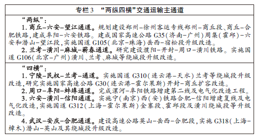 交通运输主通道。加快推进国家铁路、高速公路等重点项目建设。完善片区外通内联通道,提高纵横向交通网络化程度,规划建设“ 两纵四横” 交通运输主通道。进一步完善铁路网络,加快普通国道升级改造,推进商丘等机场建设。完善潜山、潢川、兰考、麻城、大悟等运输枢纽功能,提高综合运输与中转能力。形成融贯武汉城市圈、中原经济区、皖江城市带,畅达长江三角洲等地区的交通运输主通道。